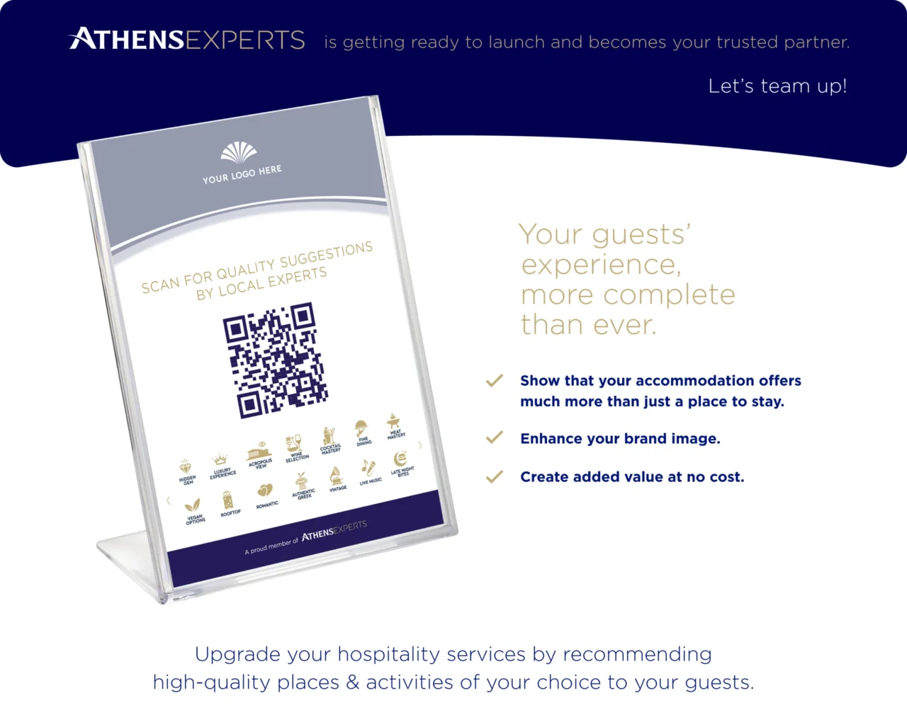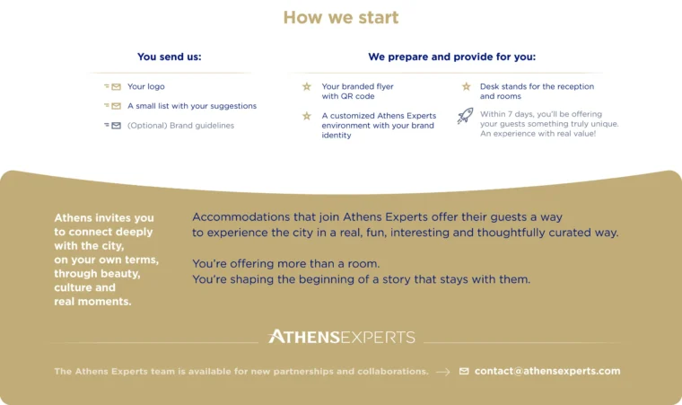 Through our collaboration with Athens Experts, we developed a comprehensive package that includes both digital and physical brand applications, tailored to attract hospitality partners. Our deliverables feature interactive elements such as dedicated suggestion pages for each property, QR codes for instant access and printed materials designed for hotel staff and guest-facing environments.