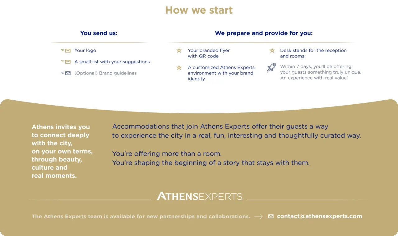 Our strategy focuses on enhancing the presence of partner accommodations and showcasing them through a fresh, high-quality platform that highlights authenticity and unique experiences within the city. The result is a mutually beneficial collaboration that brings value both to hospitality businesses and to visitors exploring Athens.