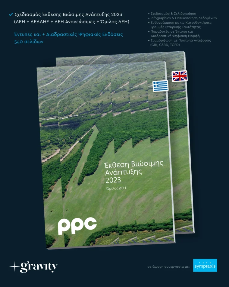 Για τον Όμιλο ΔΕΗ, έναν από τους μεγαλύτερους απολογισμούς βιωσιμότητας στην Ελλάδα, σχεδιάσαμε και υλοποιήσαμε τον Απολογισμό Βιωσιμότητας 2023, που καλύπτει τη ΔΕΗ, τον ΔΕΔΔΗΕ και τη ΔΕΗ Ανανεώσιμες. Κάθε απολογισμός ξεπέρασε τις 540 σελίδες και παραδόθηκε τόσο σε έντυπη μορφή όσο και σε πλήρως διαδραστική ψηφιακή έκδοση, στα Ελληνικά και στα Αγγλικά.